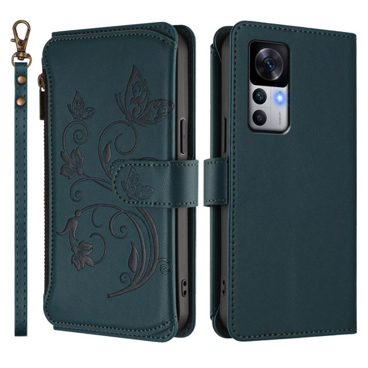 Funda de cuero con cremallera para Xiaomi 12T / 12T Pro / Redmi K50 Ultra, diseño de mariposas, flores y mariposas (verde oscuro)