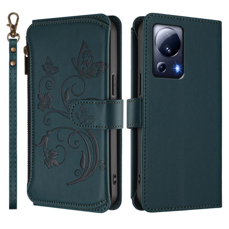 Funda de cuero con cremallera para Xiaomi 13 Lite / Civi 2, diseño de mariposas y flores (verde oscuro)