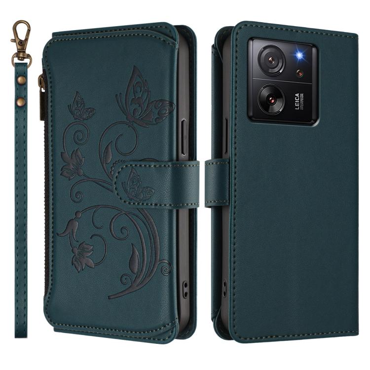 Funda de cuero con cremallera para Xiaomi 13T / 13T Pro / Redmi K60 Ultra, diseño de mariposas, flores y mariposas (verde oscuro)