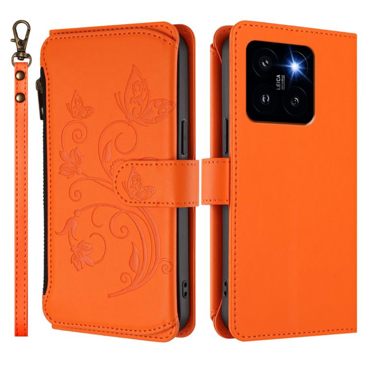 Funda de cuero con cremallera para Xiaomi 14 Pro, diseño de mariposas, flores y múltiples tarjetas (naranja)