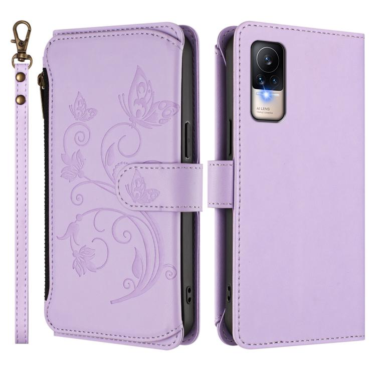 Funda de cuero con cremallera para Xiaomi Civi 1S, diseño de mariposas, flores y múltiples tarjetas (morado claro)