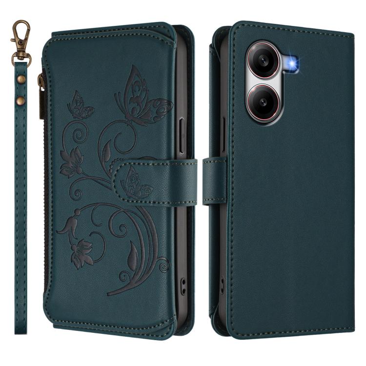 Funda de cuero con cremallera para Xiaomi Poco X7 Pro, diseño de mariposas, flores y mariposas (verde oscuro)