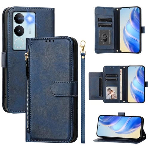Funda de Cuero con Cremallera y Ranuras para Múltiples Tarjetas para Vivo V29 5G/V29 Pro (Azul)
