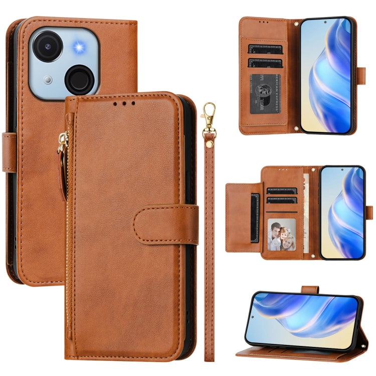 Funda de Cuero con Cremallera y Ranuras para Tarjetas para Itel A50C (Marrón)