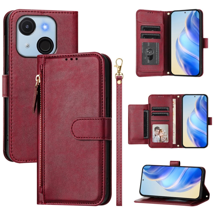 Funda de Cuero con Cremallera y Ranuras para Tarjetas para Itel A50C (Rojo Oscuro)