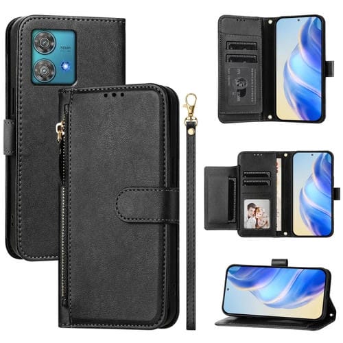 Funda de Cuero con Cremallera y Ranuras para Tarjetas para Motorola Edge 40 Neo (Negro)