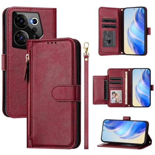 Funda de Cuero con Cremallera para Tecno Camon 20 Premier con Ranuras para Tarjetas (Rojo Oscuro)
