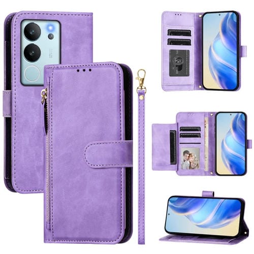 Funda de Cuero con Cremallera y Ranuras para Varias Tarjetas para Vivo V29E 5G / Y200 5G (Morado)