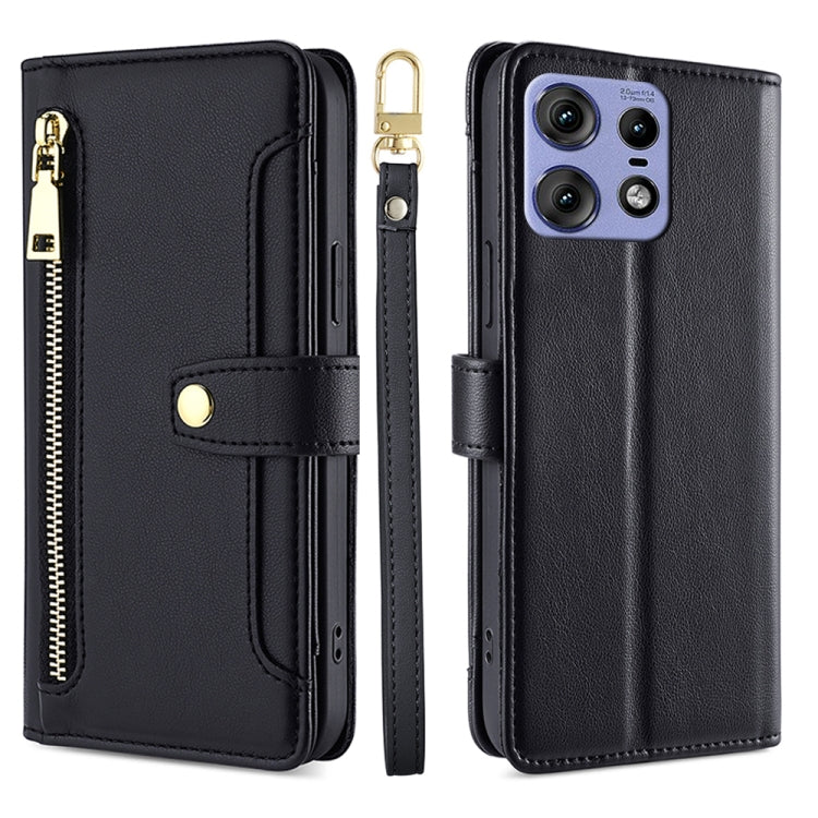 Funda de Cuero con Cremallera y Textura de Oveja para Motorola Edge 50 Pro 5G (Negra)