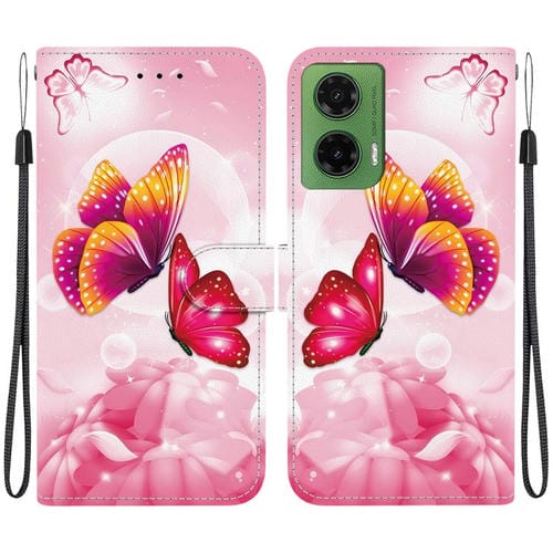 Funda de Cuero Motorola Moto G35 con Dibujo de Colores y Textura de Cristal (Mariposas Rosas)