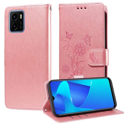 Funda de Cuero con Diseño de Mariposas y Flores En Relieve para Vivo Y15A 4G Global / Y15S 4G (Oro Rosa)