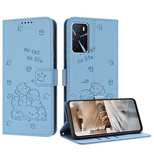 Funda de Piel con Diseño de Gatito En Relieve y Cordón para Oppo A16/A16S/A54S (Azul)
