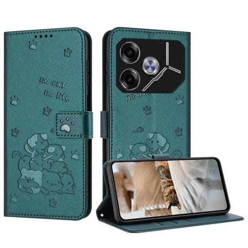 Funda de Cuero para Tecno Pova 6 Pro y Pova 6 5G con Diseño de Gatito en Relieve y Cordón (Verde Oscuro)