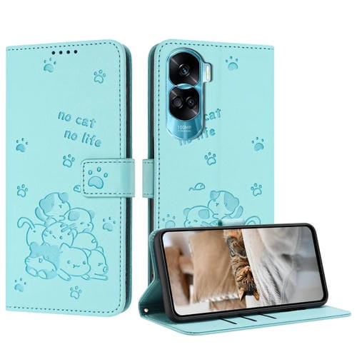 Funda de Piel con Diseño de Gatito en Relieve y Cordón para Honor 90 Lite/X50I 5G (Verde Menta)