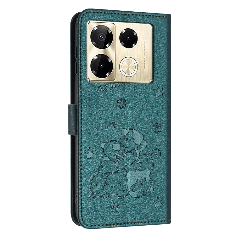 Funda de Cuero Infinix Note 40 Pro 4G/5G con Diseño de Gatito En Relieve y Cordón (Verde Oscuro)