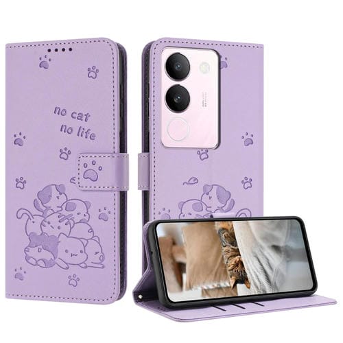 Funda de Piel con Diseño de Gatito En Relieve y Cordón para Vivo S17/S17 Pro/S17T (Morado)