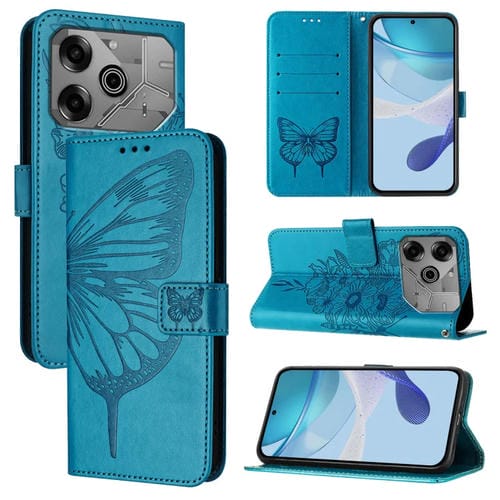 Funda de Cuero para Tecno Pova 6 Neo con Diseño de Mariposa en Relieve (Azul)