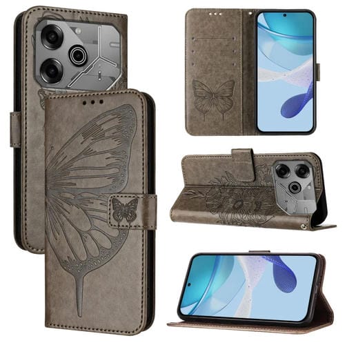 Funda de Cuero para Tecno Pova 6 Neo con Diseño de Mariposa En Relieve (Gris)