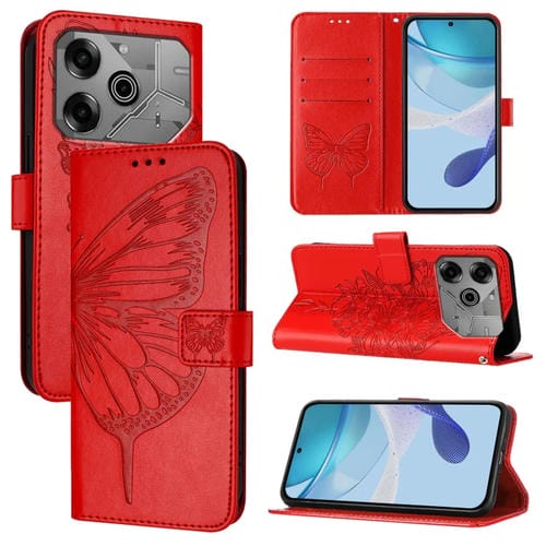 Funda de Cuero para Tecno Pova 6 Neo con Diseño de Mariposa en Relieve (Rojo)