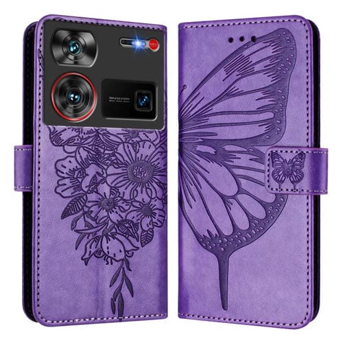 Funda de Cuero para ZTE Nubia Z60 Ultra con Diseño de Mariposa En Relieve (Morado)