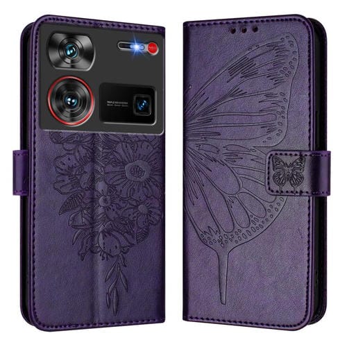 Funda de Cuero para ZTE Nubia Z60 Ultra con Diseño de Mariposa En Relieve (Morado Oscuro)