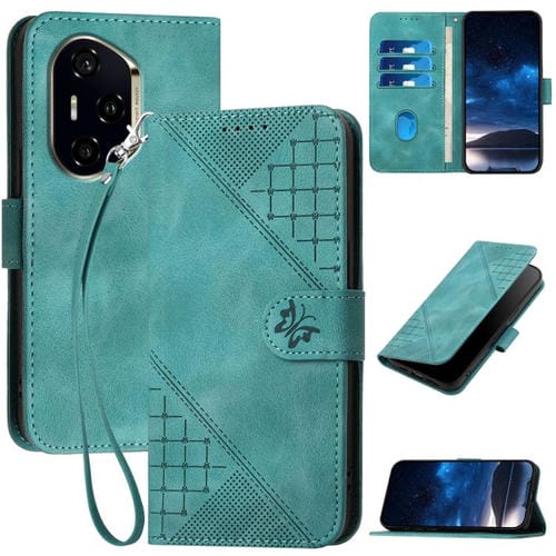 Funda de Cuero para Honor 300 Pro y 300 Ultra con Diseño Mariposa en Relieve y Cordón (Azul Claro)