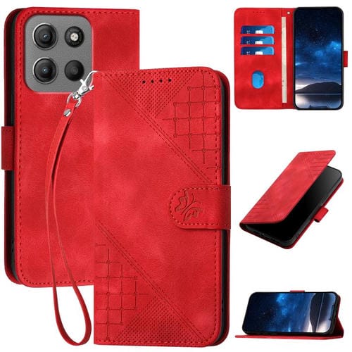 Funda de Cuero Motorola Moto G15 con Diseño Mariposa en Relieve y Cordón (Rojo)