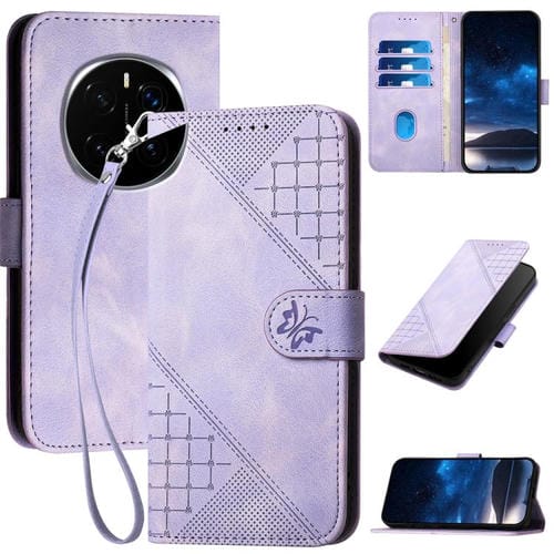 Funda de Cuero para Honor Magic7 Pro con Cordón Diseño Mariposas en Relieve Cuadrícula (Morado Claro)