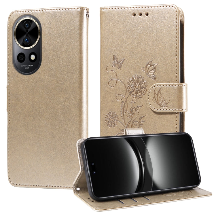 Funda de Cuero para Huawei Nova 12 con Diseño de Mariposas y Flores en Relieve (Dorada)