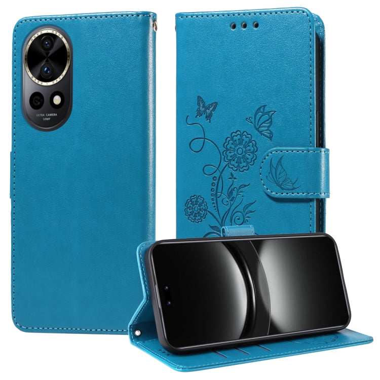 Funda de Cuero para Huawei Nova 12 Pro y Nova 12 Ultra con Diseño de Mariposas y Flores en Relieve (Azul)