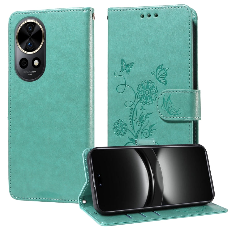 Funda de Cuero para Huawei Nova 12 con Diseño de Mariposas y Flores en Relieve (Verde)