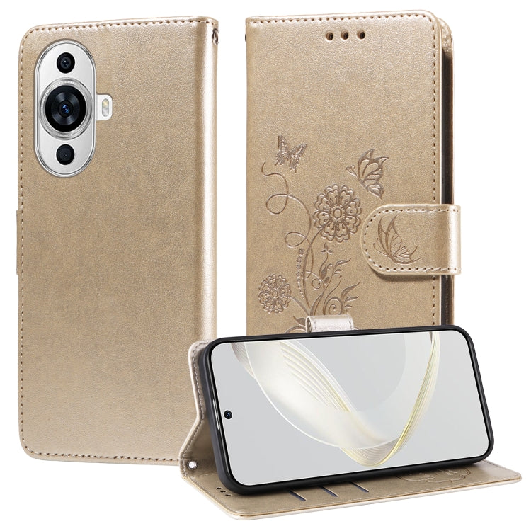 Funda de Cuero Huawei Nova 12S 4G con Diseño de Mariposas y Flores en Relieve (Dorada)