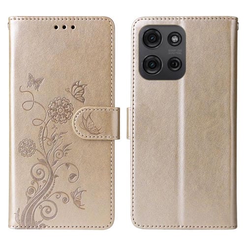 Funda de Cuero para Motorola Moto G75 5G con Diseño de Mariposas y Flores en Relieve (Dorada)