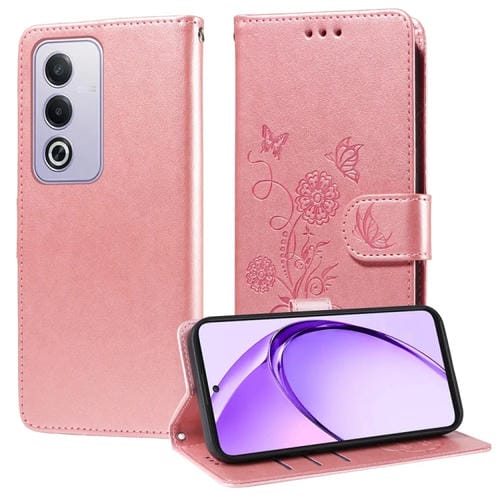 Funda de Cuero con Diseño de Mariposas y Flores En Relieve para Oppo A3 Pro 5G Global/India (Oro Rosa)