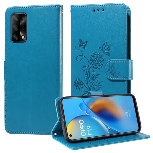 Funda de Cuero con Diseño de Mariposas y Flores En Relieve para Oppo A74 4G / F19 4G / F19S / A95 4G (Azul)