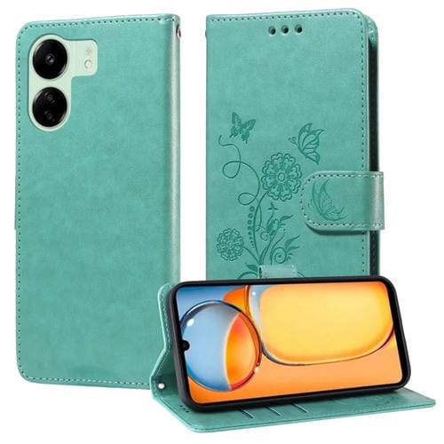 Funda de Cuero con Diseño de Mariposas y Flores En Relieve para Redmi 13C 5G/4G/13R (Verde)
