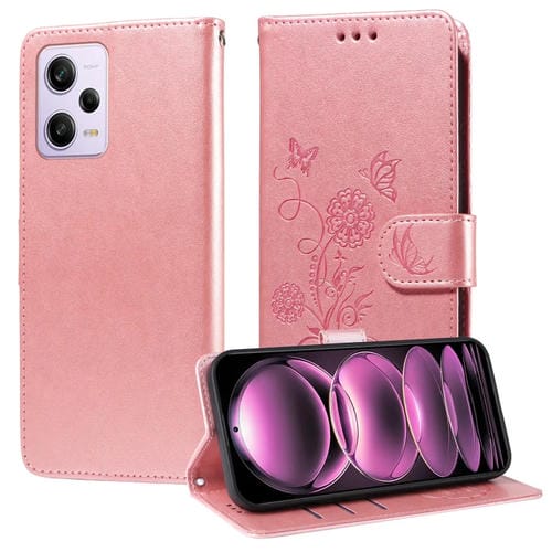 Funda de Cuero con Diseño de Mariposas y Flores En Relieve para Redmi Note 12 Explorer/Note 12 Pro+ (Oro Rosa)