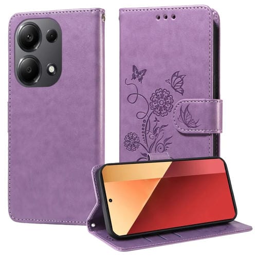 Funda de Cuero con Diseño de Mariposas y Flores En Relieve para Redmi Note 13 Pro 4G (Morado)