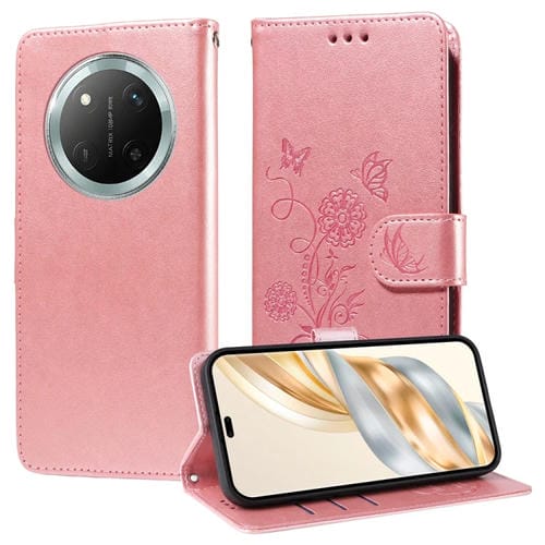 Funda de Cuero Honor X9C Magic7 Lite con Diseño de Mariposas y Flores en Relieve (Oro Rosa)