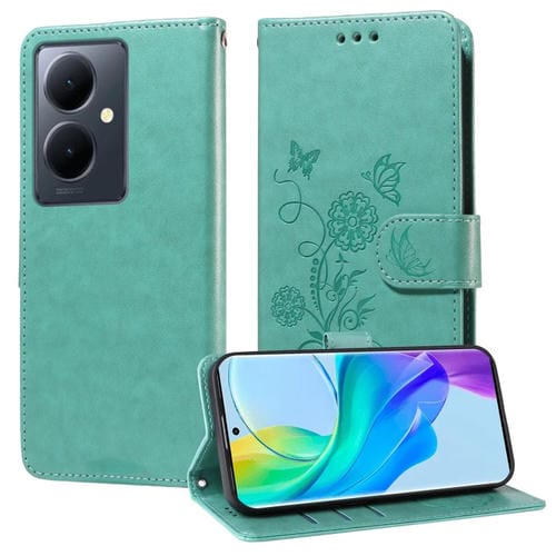 Funda de Cuero con Diseño de Mariposas y Flores En Relieve para Vivo Y78 5G (Verde)