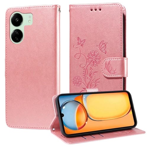 Funda de Cuero con Diseño de Mariposas y Flores En Relieve para Xiaomi Poco C65/M6 5G (Oro Rosa)
