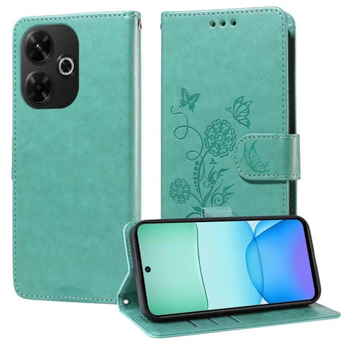 Funda de Cuero con Diseño de Mariposas y Flores En Relieve para Xiaomi Poco M6 4G (Verde)