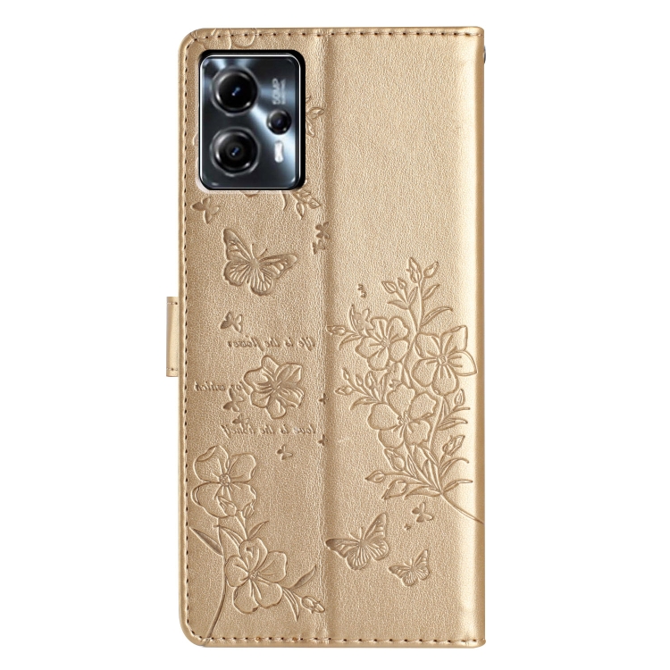 Funda de Cuero Motorola Moto G53 5G con Diseño de Mariposas y Flores (Dorada)