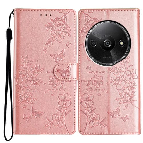 Funda de Cuero con Mariposas y Flores para Redmi A3 (Oro Rosa)