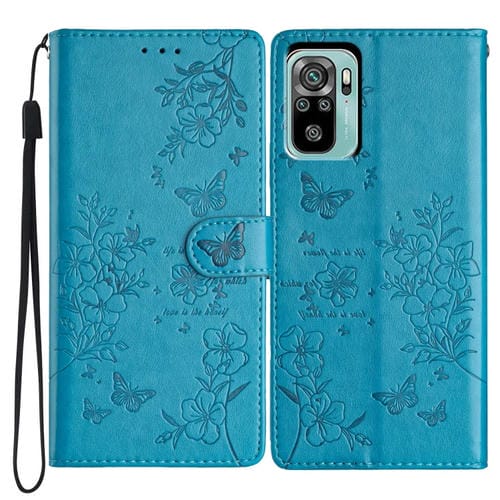 Funda de Cuero con Diseño de Mariposas y Flores para Redmi Note 10S (Azul)