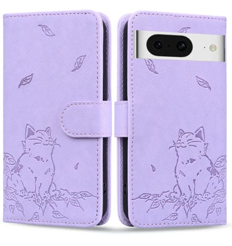Funda de Cuero Google Pixel 8 con Estampado de Gato (Morado)