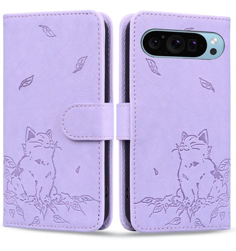 Funda de Cuero para Google Pixel 9/9 Pro con Estampado de Gato (Morado)