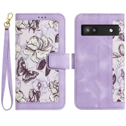 Funda de Cuero con Estampado Floral para Google Pixel 6A con Cordón (Morado Claro)