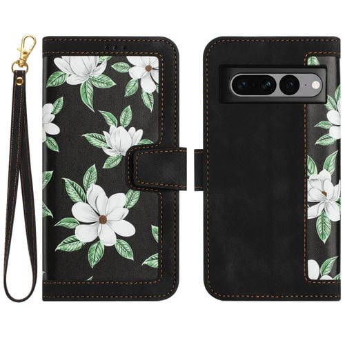 Funda de Cuero con Estampado Floral para Google Pixel 7 Pro con Cordón (Negro)