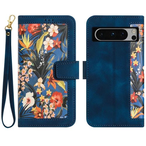 Funda de Cuero con Estampado Floral para Google Pixel 8 Pro con Cordón (Azul Oscuro)
